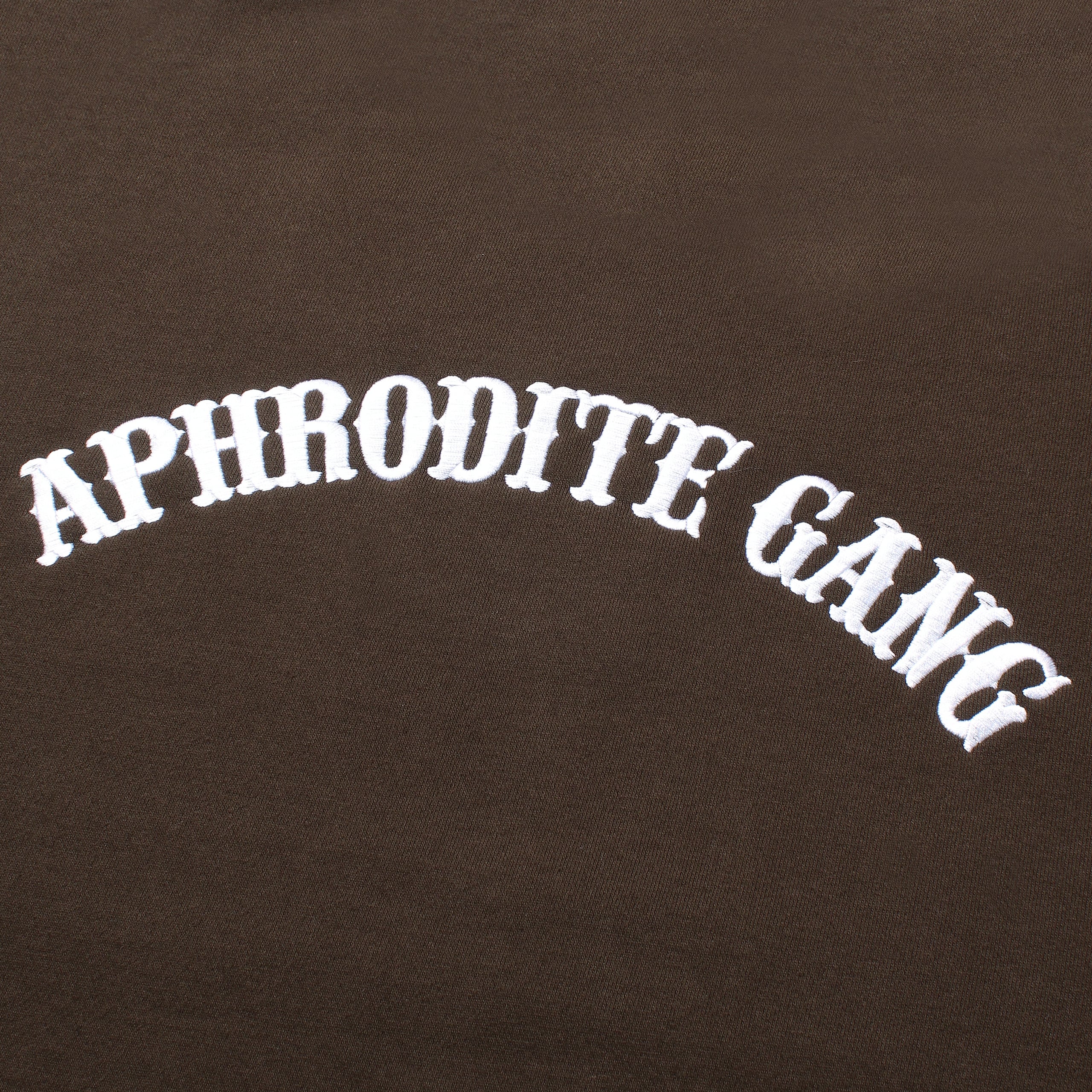 フロントにAPHRODITE GANGのアーチロゴ刺繍が入ったクルーネックスウェットシャツ。