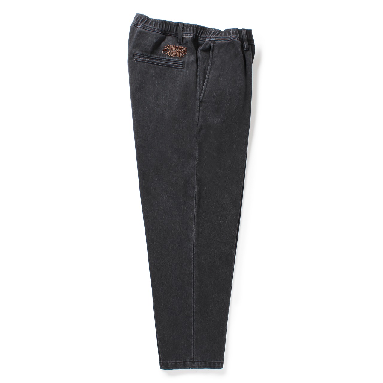 ウォッシュド加工を施したブラックデニムのデニムパンツ。