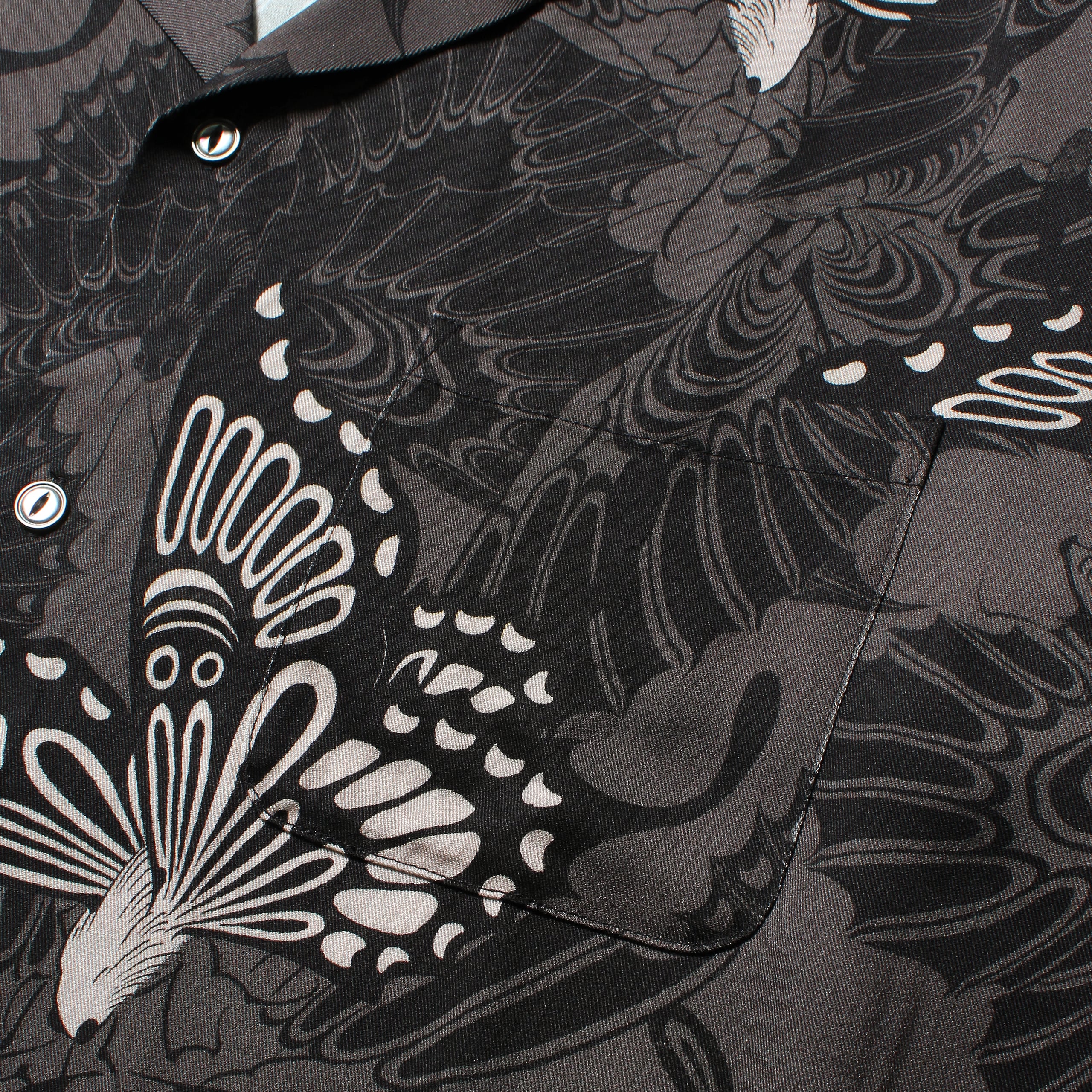 黒蝶貝の猫目ボタンを使用。左胸にポケット付き。