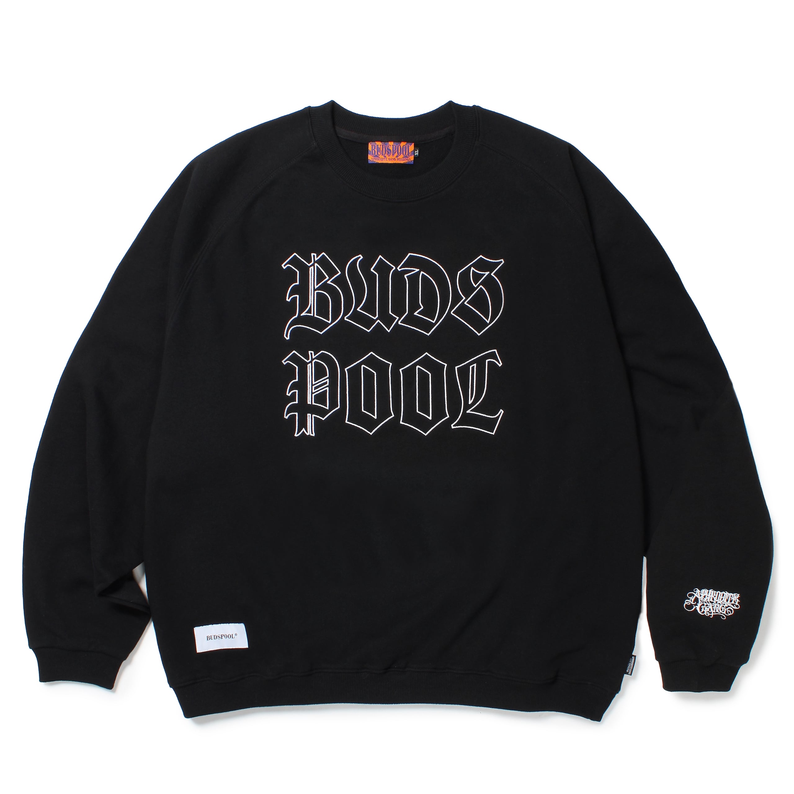 フロントにBUDSPOOLのロゴ、左袖にクラシックロゴの刺繍が入ったクルーネックスウェットシャツ。