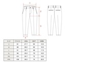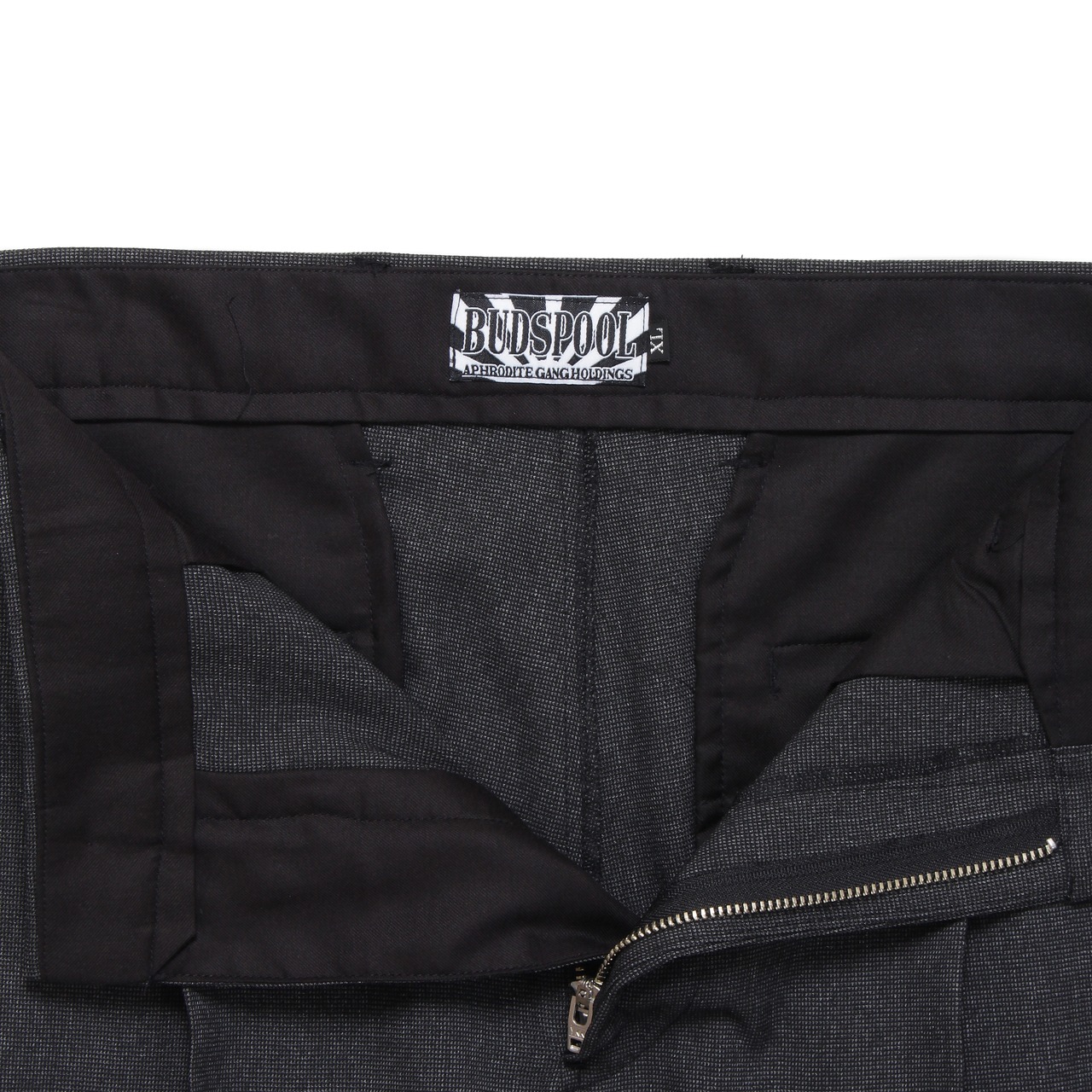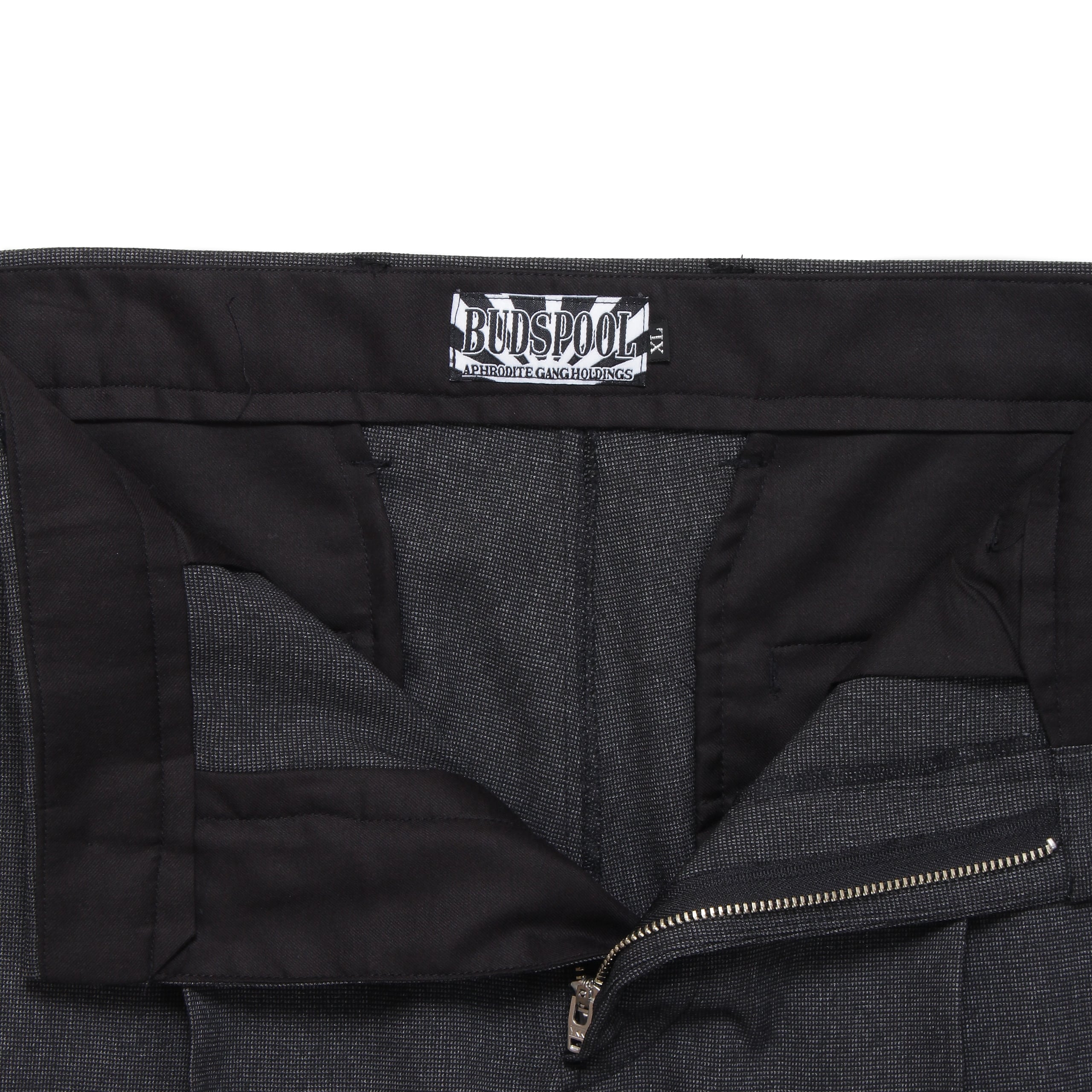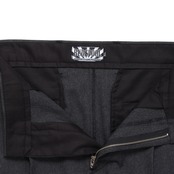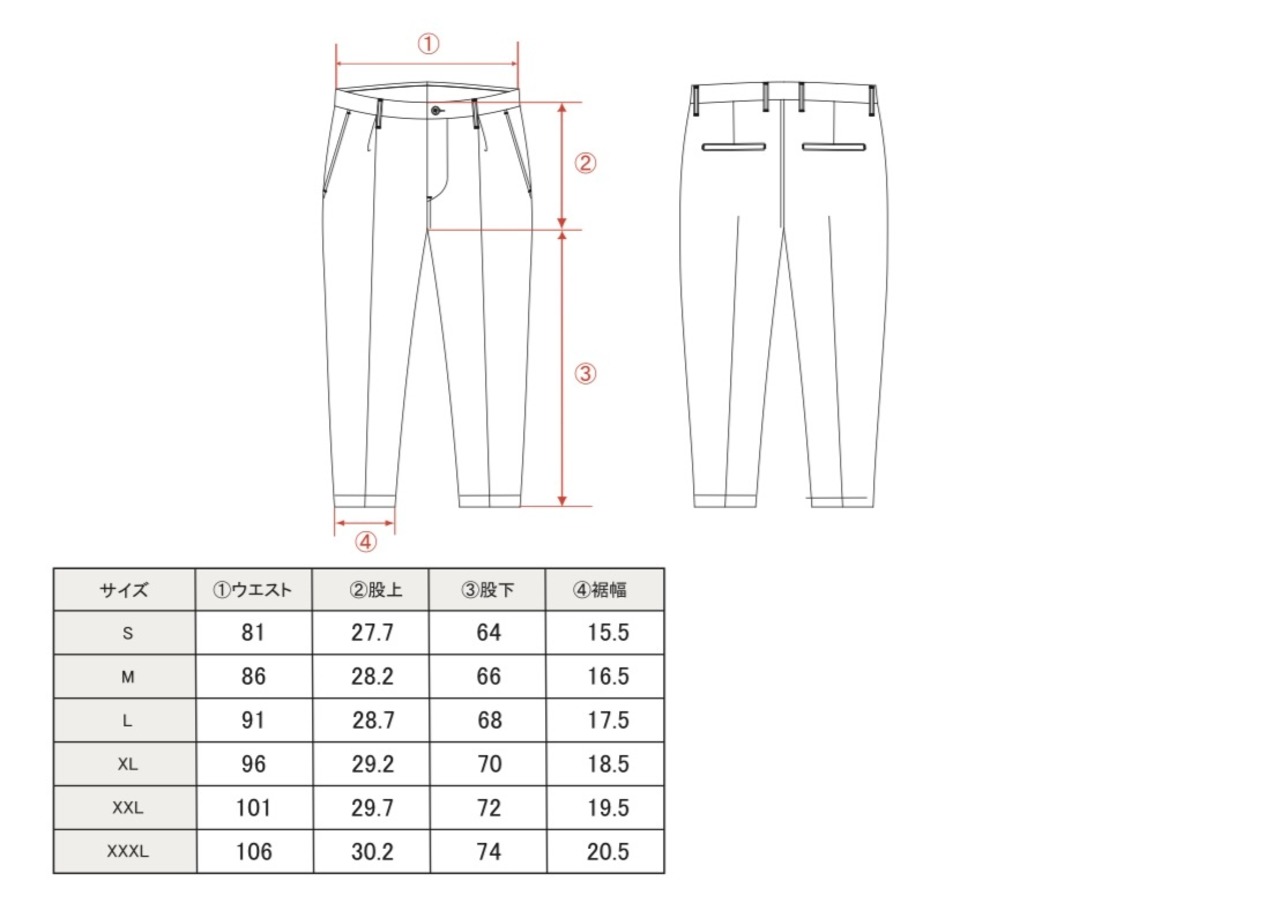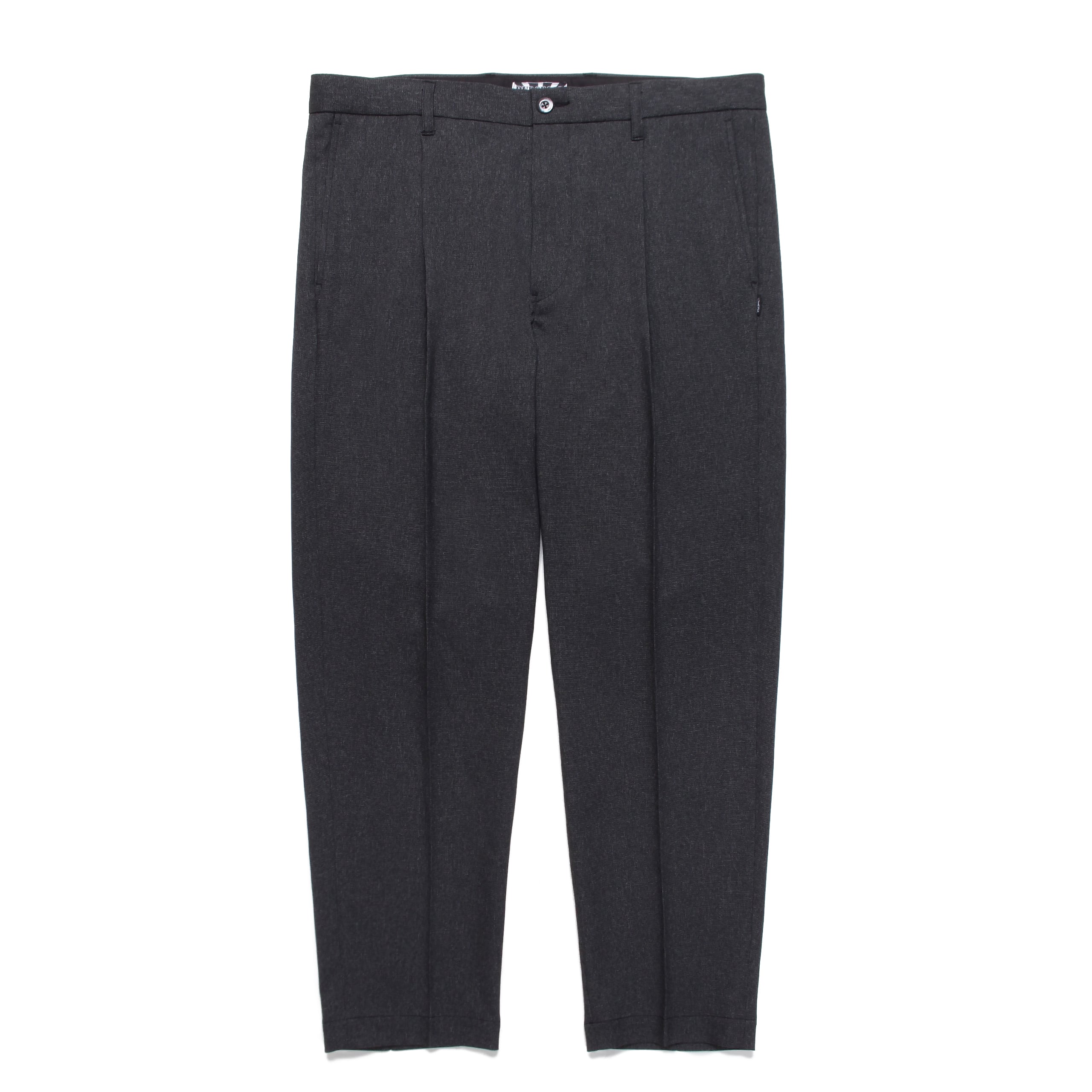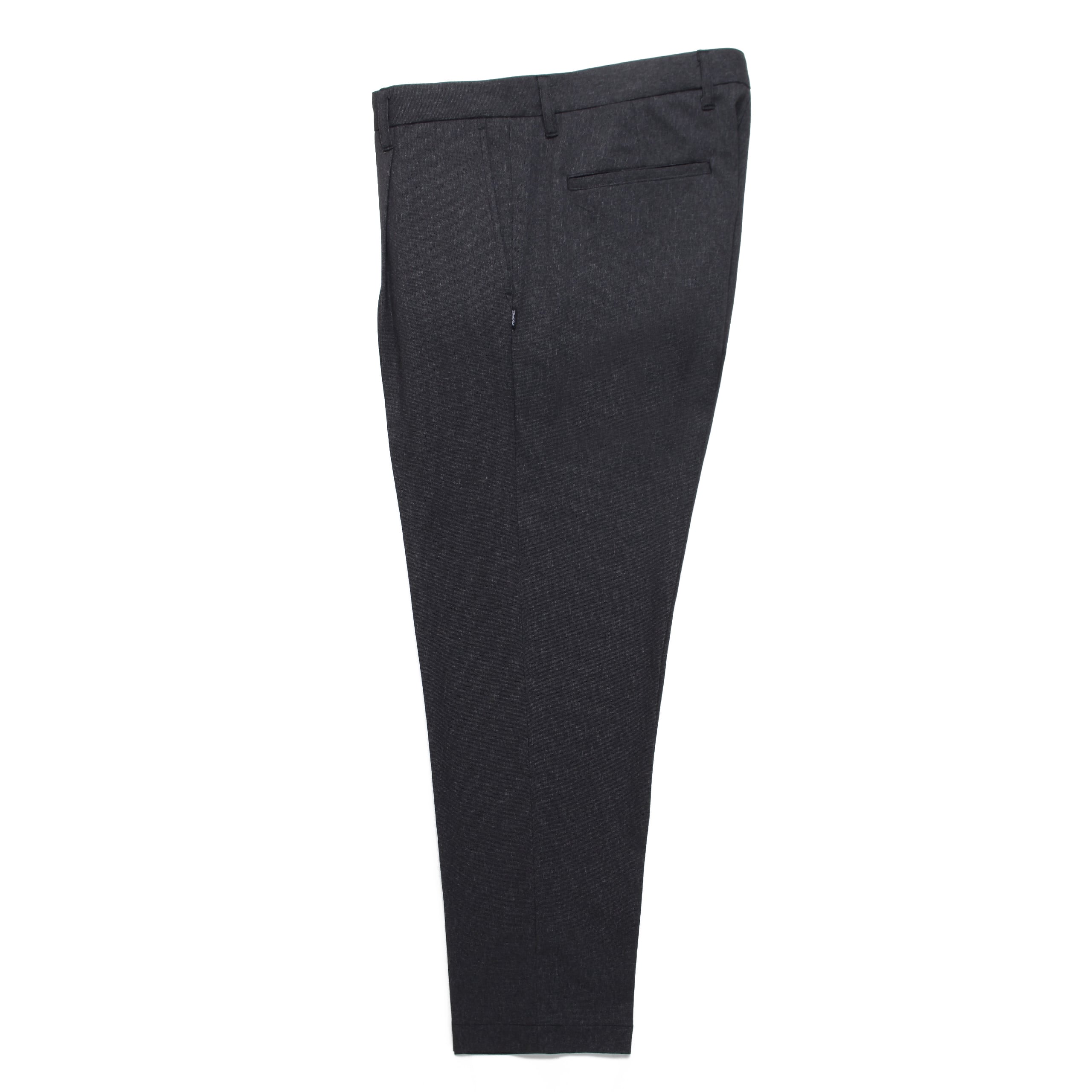 テーパードシルエットのシワになりにくいポリエステル生地を使用したトラウザーズ。