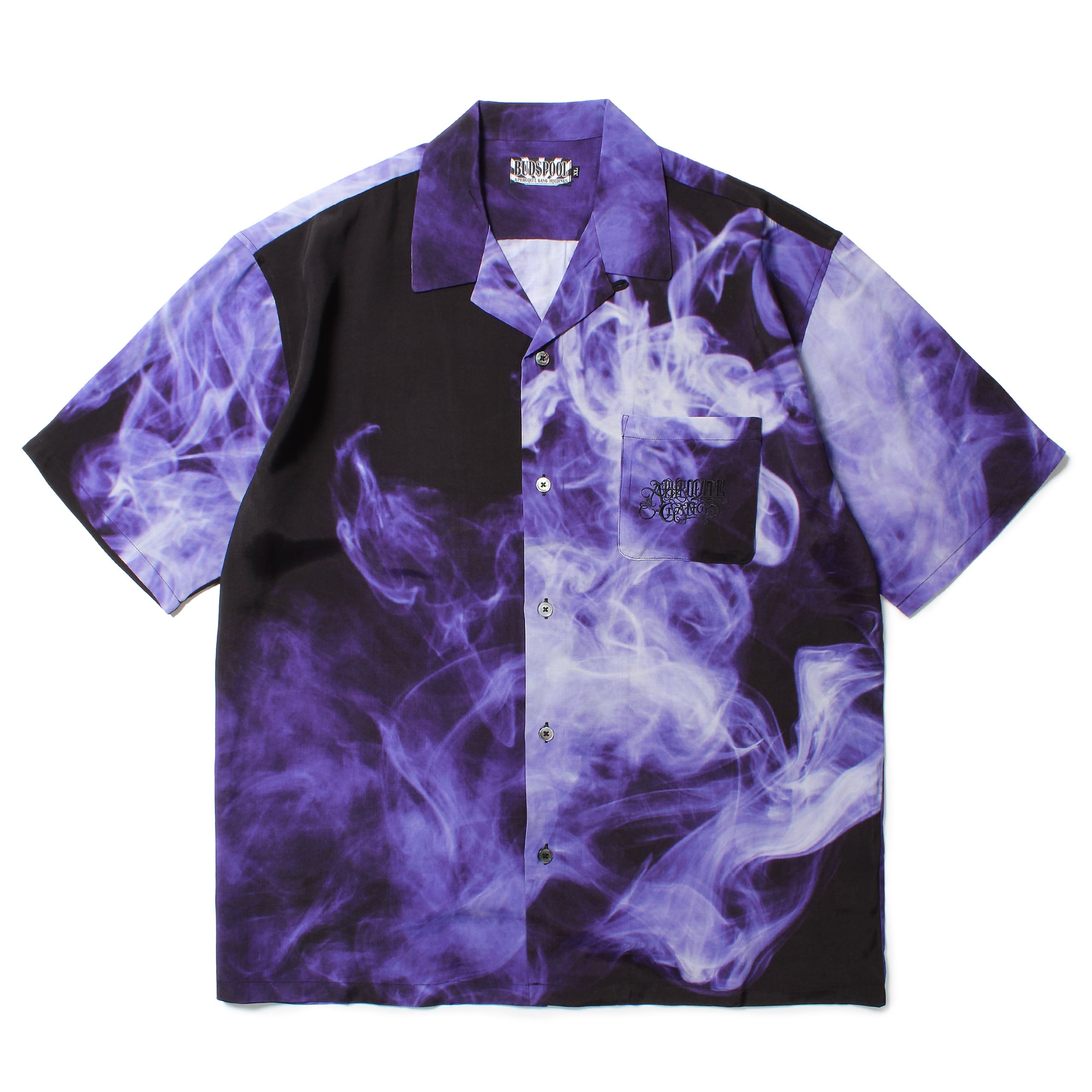 BUDSPOOLオリジナルのスモークパターンをレーヨン生地にプリントした総柄シャツ。