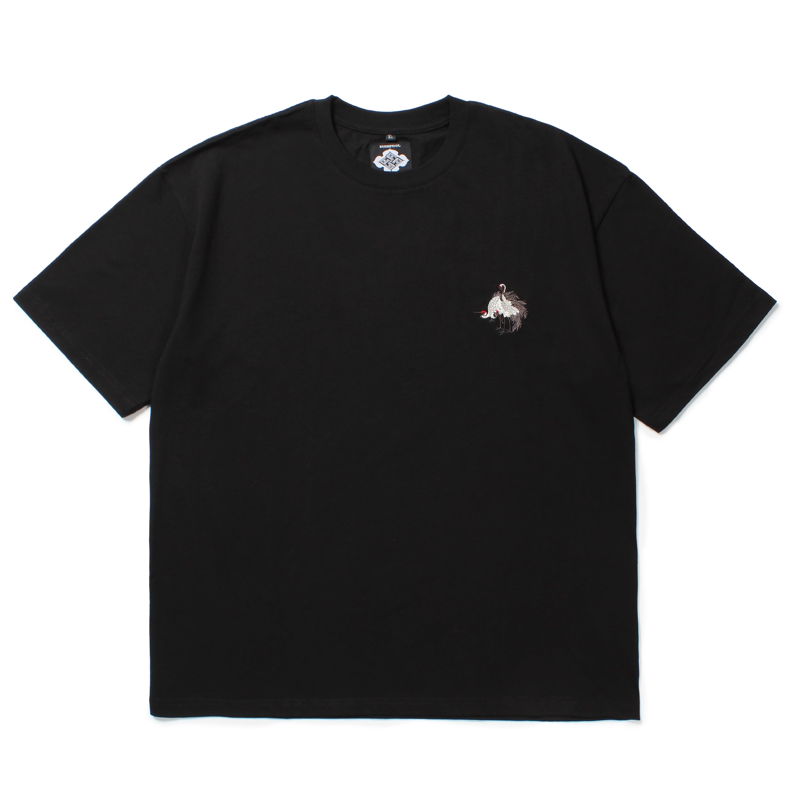 左胸に赤目鶴の刺繍が入ったショートスリーブTシャツ。