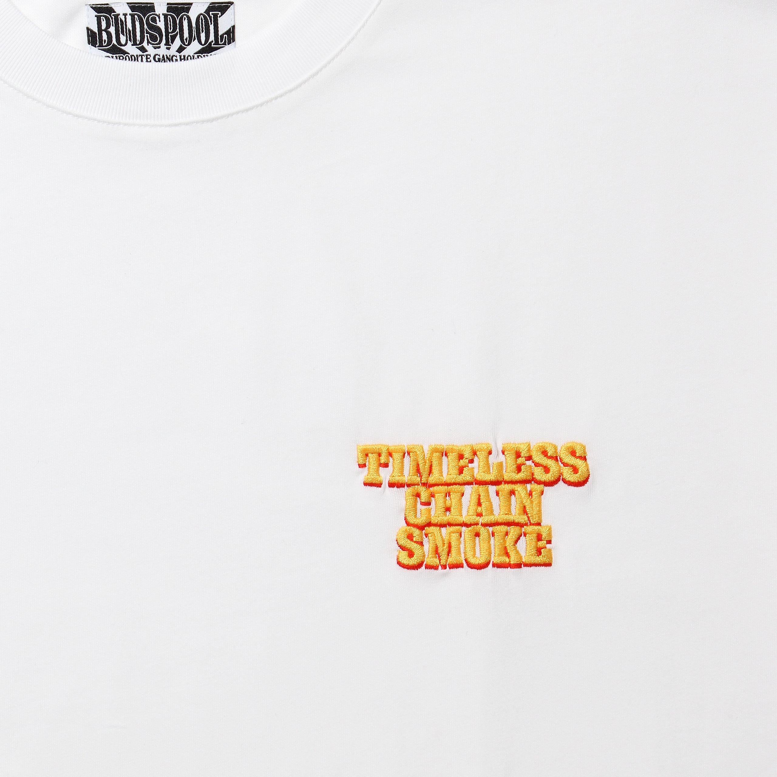 左胸にTIMELESS CHAIN SMOKEロゴの刺繍が入ったショートスリーブTシャツ。