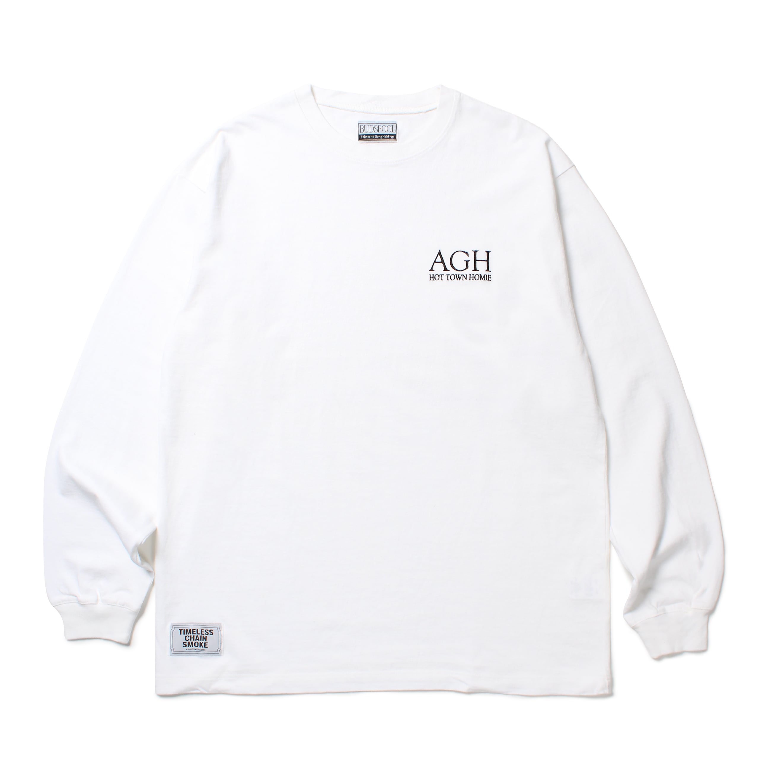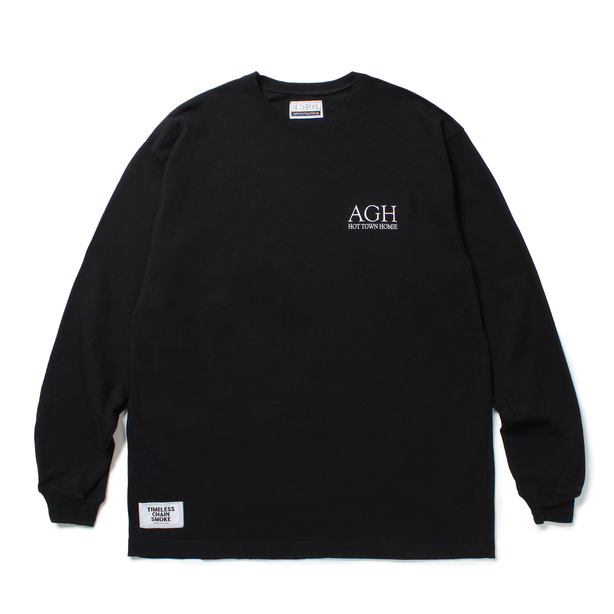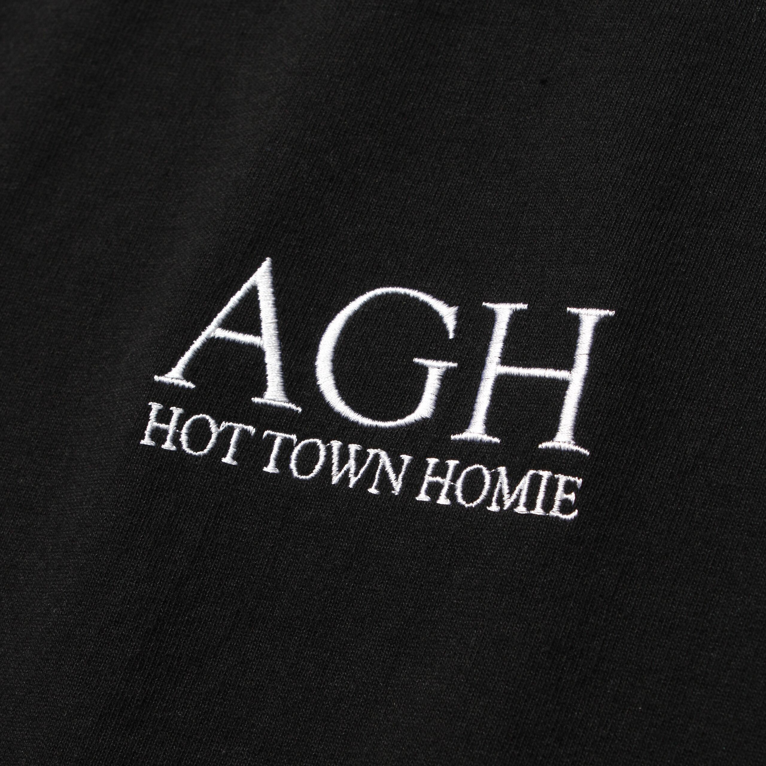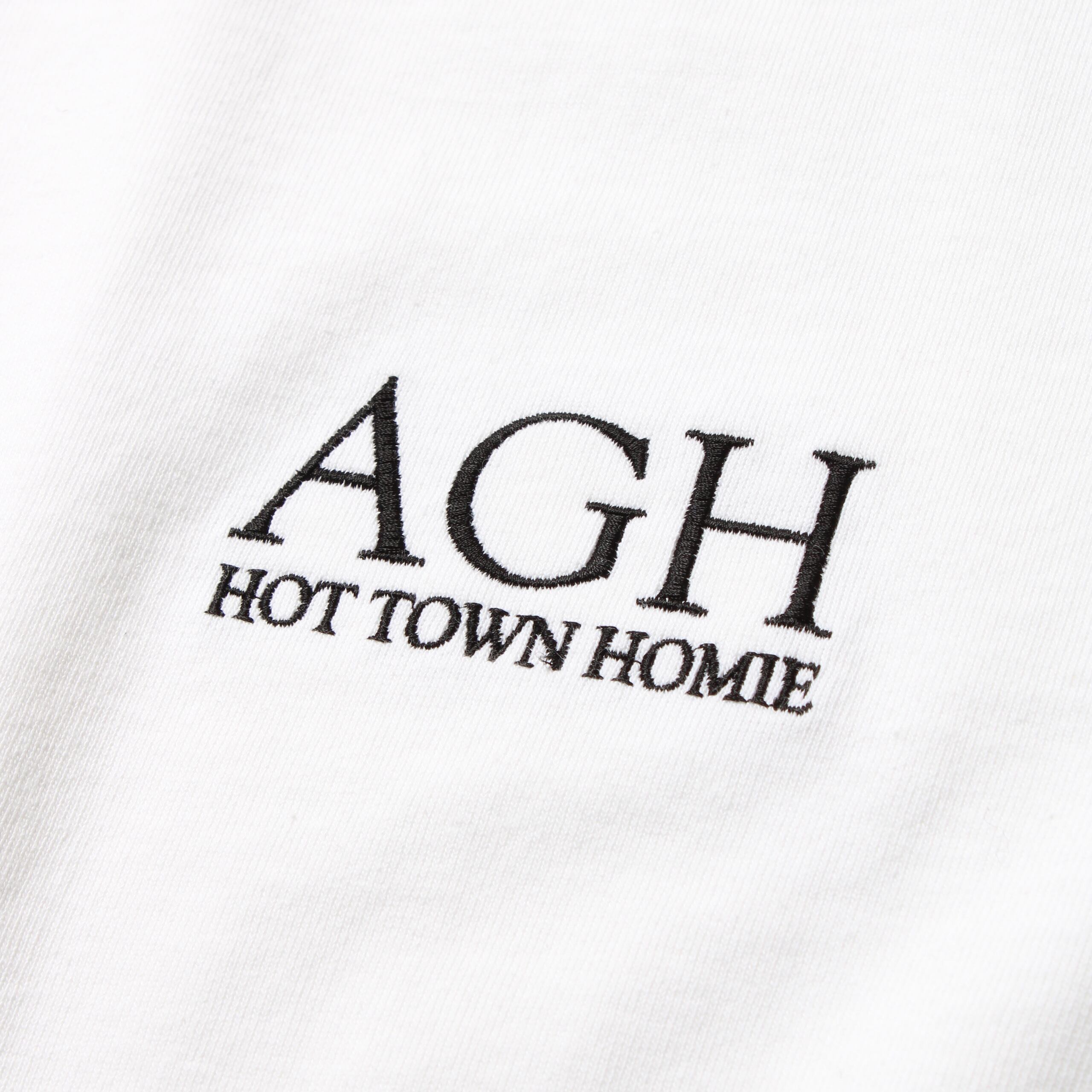 左胸にAGH HOT TOWN HOMIEのロゴ刺繍が入ったロングスリーブTシャツ。