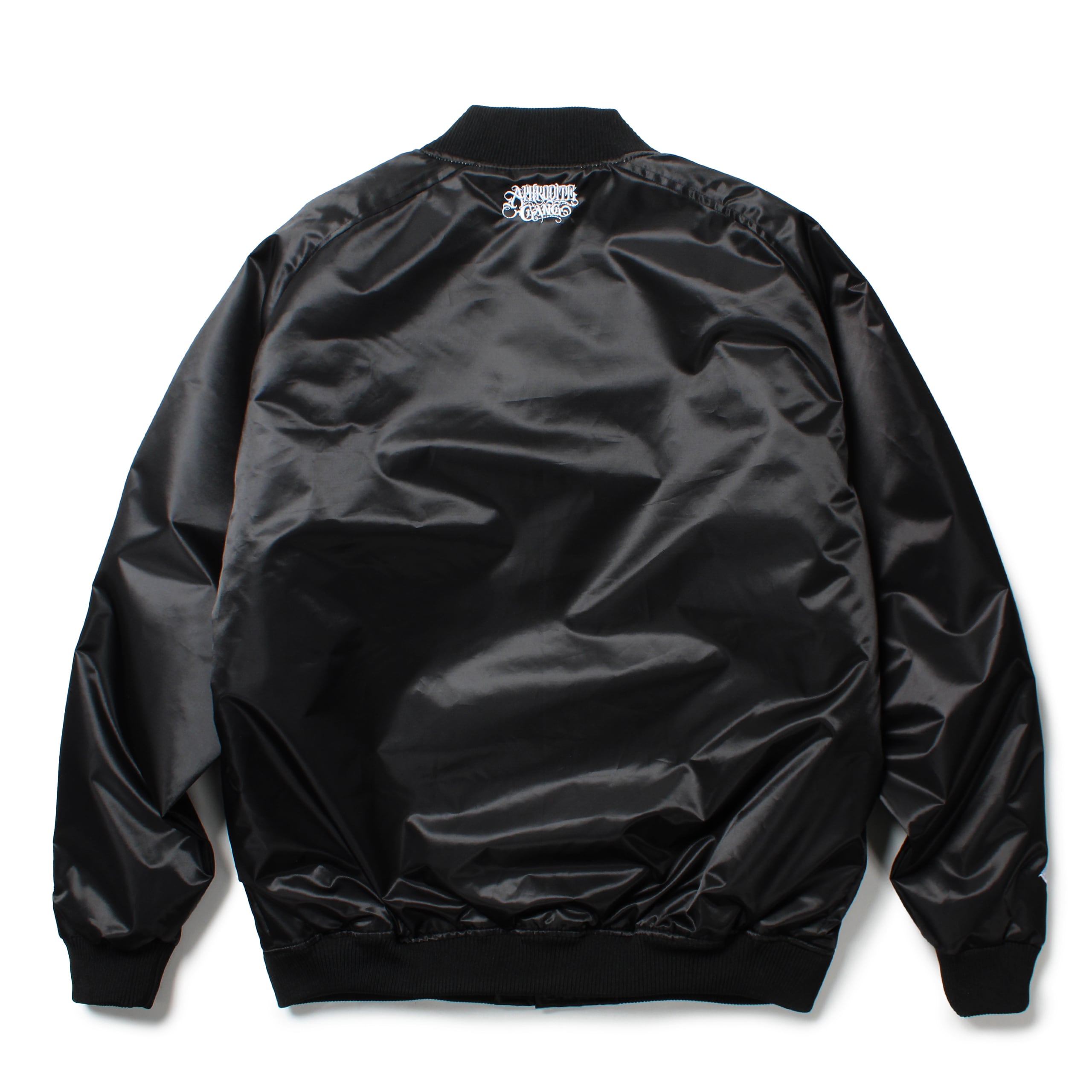 胸にクラシックロゴの刺繍ワッペンがついた光沢のあるナイロン素材のチームジャケット。
