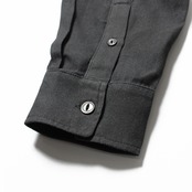 黒蝶貝の猫目ボタン、左胸にポケット、コラボレーション仕様のネーム付き。